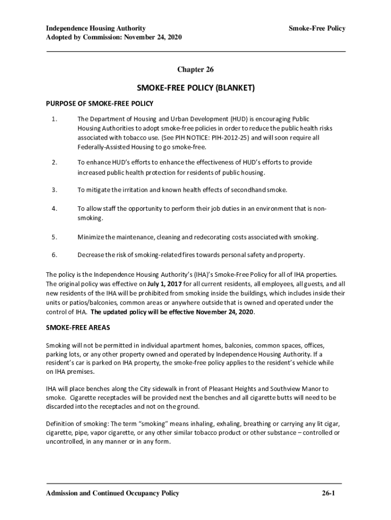 Independence Housing Authority Adopted by Commission: November 24, 2020SmokeFree PolicyChapter 26SMOKEFREE POLICY (BLANKET) PURPOSE OF SMOKEFREE POLICY 1.The Department of Housing and Urban Development