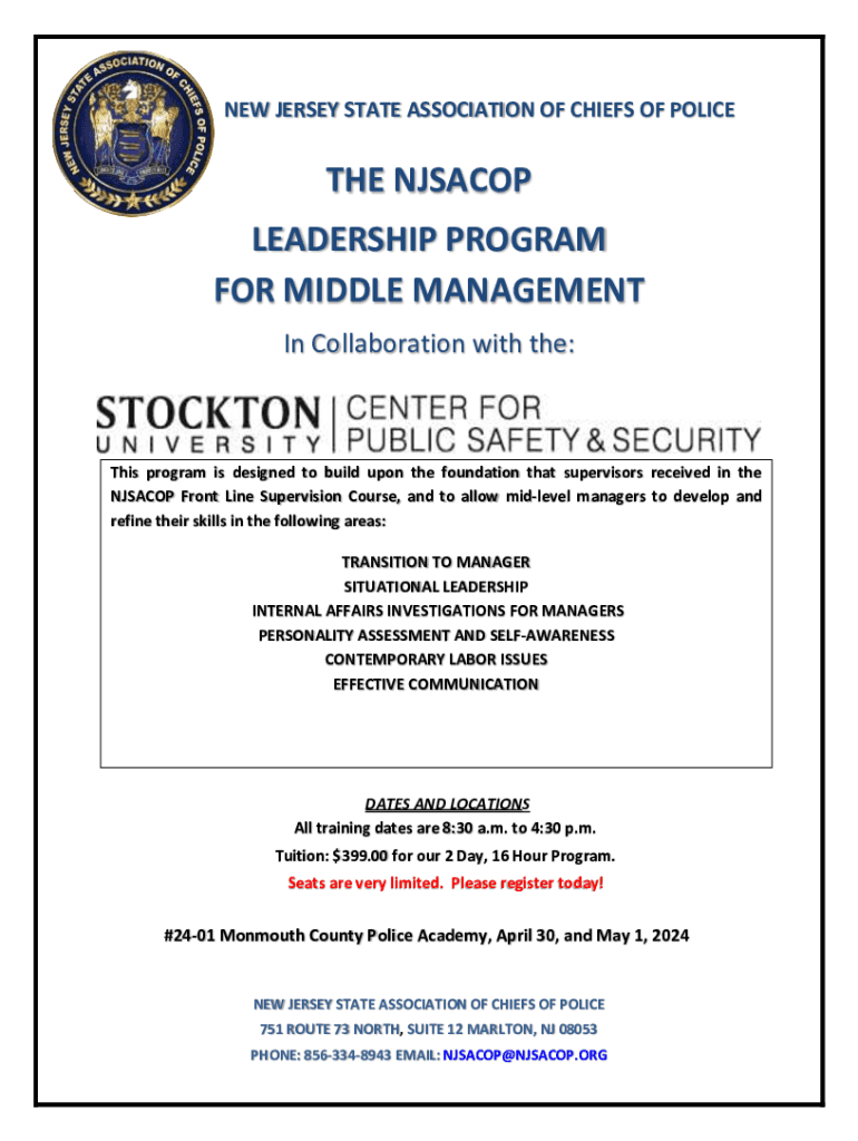 NEW JERSEY STATE ASSOCIATION OF CHIEFS OF POLICETHE NJSACOP LEADERSHIP PROGRAM FOR MIDDLE MANAGEMENT In Collaboration with the:This program is designed to build upon the foundation that supervisors