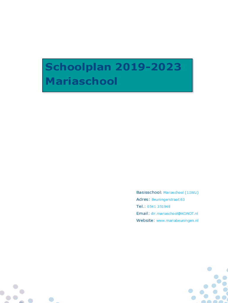 Schoolplan 20192023 MariaschoolBasisschool: Mariaschool (11WU) Adres: Beuningerstraat 63 Tel.: 0541 351948 Email: dir.mariaschool@KONOT.nl Website: www.mariabeuningen.nlInhoudInleiding .............................................................................................................................