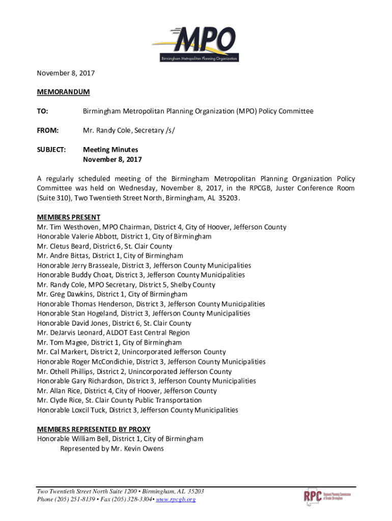 November 8, 2017 MEMORANDUM TO:Birmingham Metropolitan Planning Organization (MPO) Policy CommitteeFROM:Mr. Randy Cole, Secretary /s/SUBJECT:Meeting Minutes November 8, 2017A regularly scheduled meeting