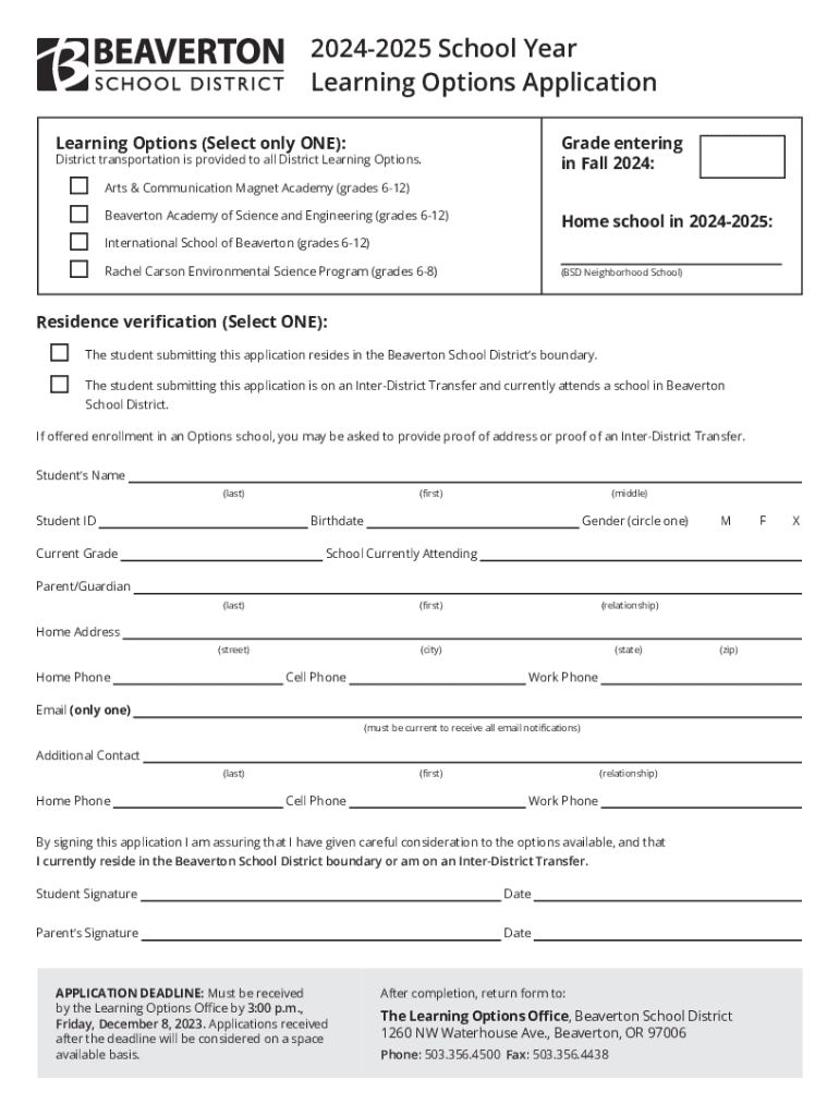 20242025 School Year Learning Options Application Learning Options (Select only ONE):Grade entering in Fall 2024:District transportation is provided to all District Learning Options. Arts & Communication