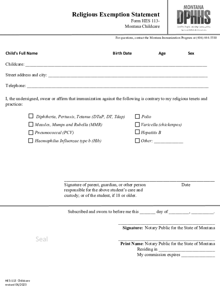 Religious Exemption StatementForm HES 113Montana ChildcareFor questions, contact the Montana Immunization Program at (406) 4445580Child\'s Full NameBirth DateAgeSexChildcare: ___ Street address and
