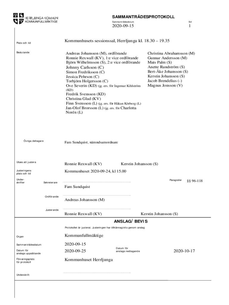 SAMMANTRDESPROTOKOLLKOMMUNFULLMKTIGESammantrdesdatumSid202009151Kommunhusets sessionssal, Herrljunga kl. 18.30 19.35Plats och tid BeslutandeAndreas Johansson (M), ordfrande Ronnie Rexwall (KV), 1:e