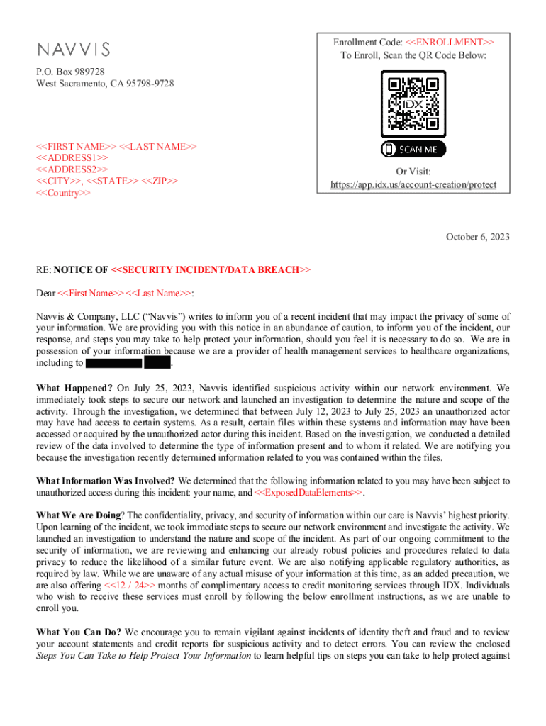 RecordIndicator000018Enrollment Code: ENROLLMENT To Enroll, Scan the QR Code Below:P.O. Box 989728 West Sacramento, CA 957989728FIRST NAME LAST NAME ADDRESS1 ADDRESS2 CITY, STATE ZIP CountryOr Visit: