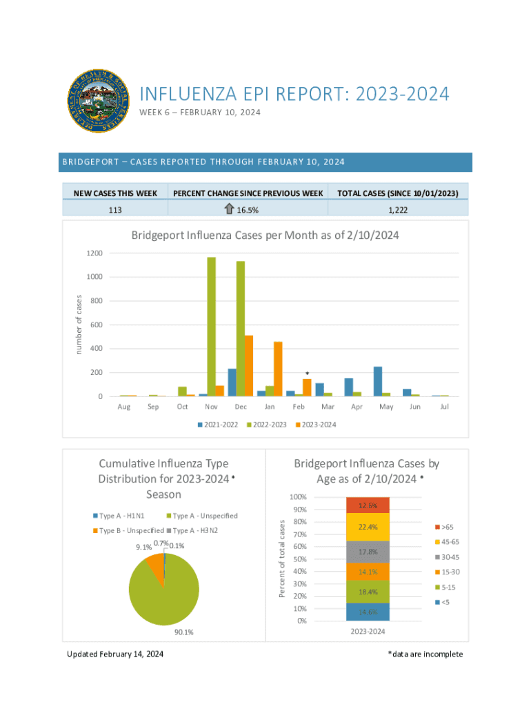 INFLUENZA EPI REPORT: 20232024 WEEK 6 FEBRUARY 10, 2024BRIDGEPORT CASES REPORTED THROUGH FEBRUARY 10, 2024 NEW CASES THIS WEEKPERCENT CHANGE SINCE PREVIOUS WEEKTOTAL CASES (SINCE 10/01/2023)11316.5%1,222Bridgeport