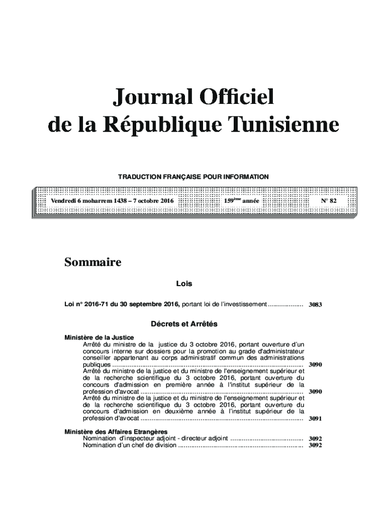 Loi n 201671 du 30 septembre 2016, portant loi de linvestissement ................... 3083Dcrets