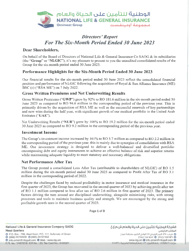 National Life and General Insurance Company SAOG and its subsidiaries Unaudited Interim Condensed Separate and Consolidated Financial Statements for the six months ended 30th June 2023Principal place