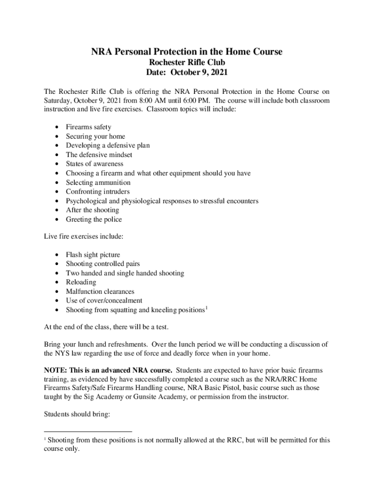 NRA Personal Protection in the Home Course Rochester Rifle Club Date: October 9, 2021 The Rochester Rifle Club is offering the NRA Personal Protection in the Home Course on Saturday, October 9, 2021
