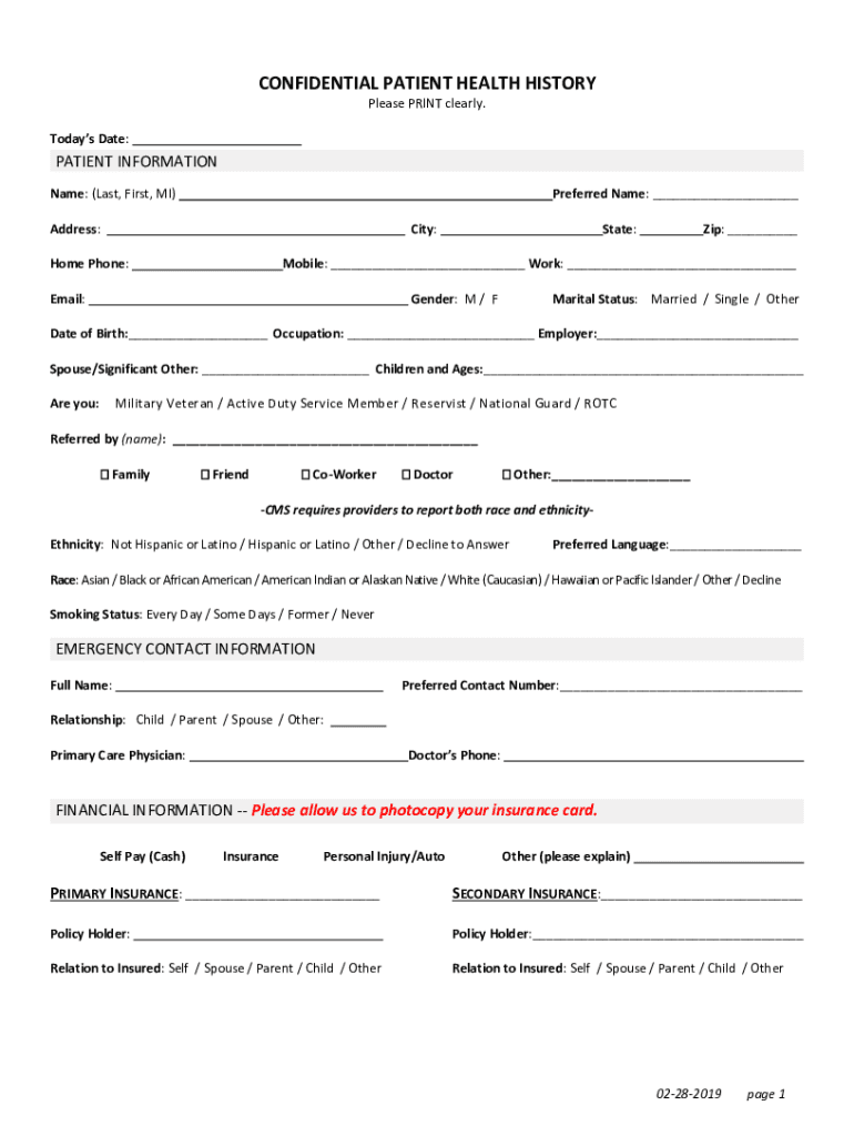 CONFIDENTIAL PATIENT HEALTH HISTORY Please PRINT clearly. Todays Date:PATIENT INFORMATION Name: (Last, First, MI)Preferred Name: ___Address:City:Home Phone:State:Zip: ___Mobile: ___ Work: ___Email:Gender: