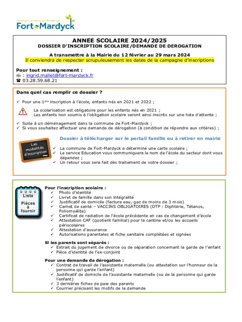 ANNEE SCOLAIRE 2024/2025DOSSIER DINSCRIPTION SCOLAIRE/DEMANDE DE DEROGATION A transmettre la Mairie du 12 fvrier au 29 mars 2024 Il conviendra de respecter scrupuleusement les dates de la campagne