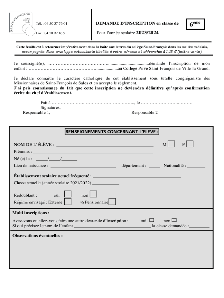 Tl. : 04 50 37 76 01DEMANDE DINSCRIPTION en classe deFax : 04 50 92 16 51Pour lanne scolaire 2023/20246meCette feuille est retourner imprativement dans la boite aux lettres du collge SaintFranois