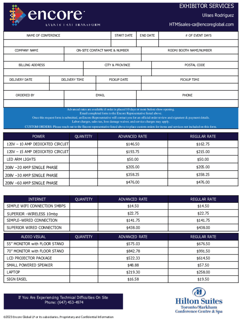 EXHIBITOR SERVICES Ulises Rodriguez HTMSsalesca@encoreglobal.com NAME OF CONFERENCESTART DATECOMPANY NAMEONSITE CONTACT NAME & NUMBERBILLING ADDRESSDELIVERY DATEEND DATECITY & PROVINCEDELIVERY TIMEORDERED
