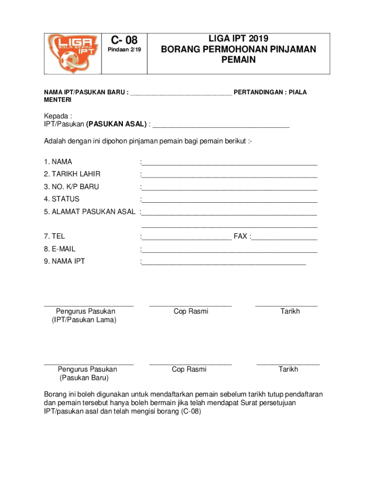 C 08 Pindaan 2/19LIGA IPT 2019 BORANG PERMOHONAN PINJAMAN PEMAINNAMA IPT/PASUKAN BARU : ___ PERTANDINGAN : PIALA MENTERIKepada : IPT/Pasukan (PASUKAN ASAL) : ___ Adalah dengan ini dipohon pinjaman