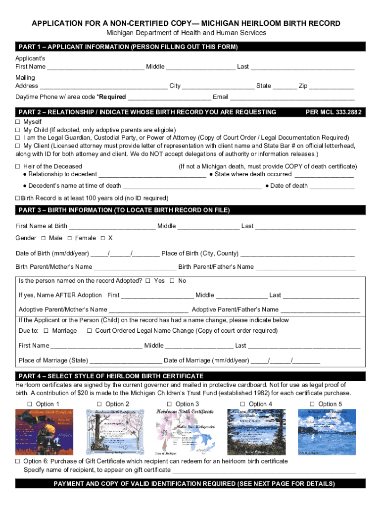 APPLICATION FOR A NONCERTIFIED COPY MICHIGAN HEIRLOOM BIRTH RECORD Michigan Department of Health and Human ServicesPART 1 APPLICANT INFORMATION (PERSON FILLING OUT THIS FORM) Applicants First Name