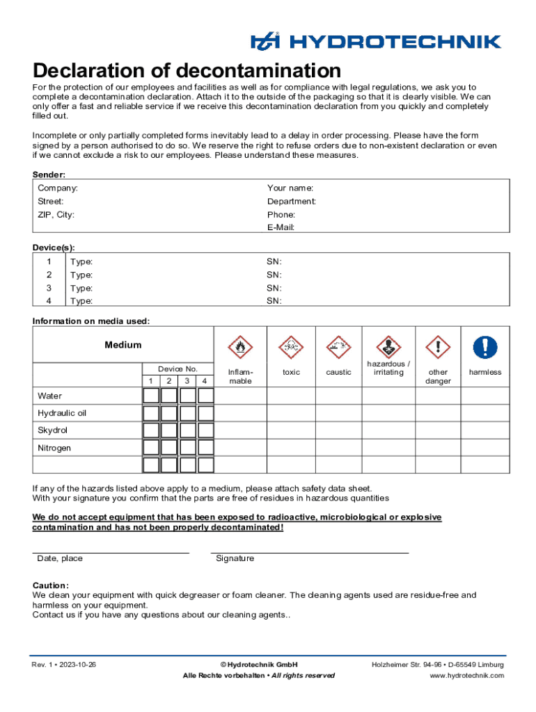 Declaration of decontaminationFor the protection of our employees and facilities as well as for compliance with legal regulations, we ask you to complete a decontamination declaration. Attach it to