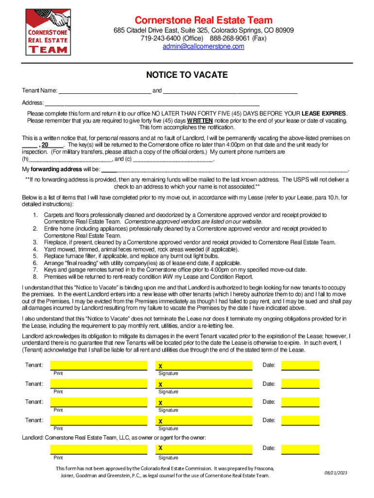 Cornerstone Real Estate Team 685 Citadel Drive East, Suite 325, Colorado Springs, CO 80909 7192436400 (Office) 8882689061 (Fax) admin@callcornerstone.comNOTICE TO VACATE Tenant Name: ___ and ___ Address: