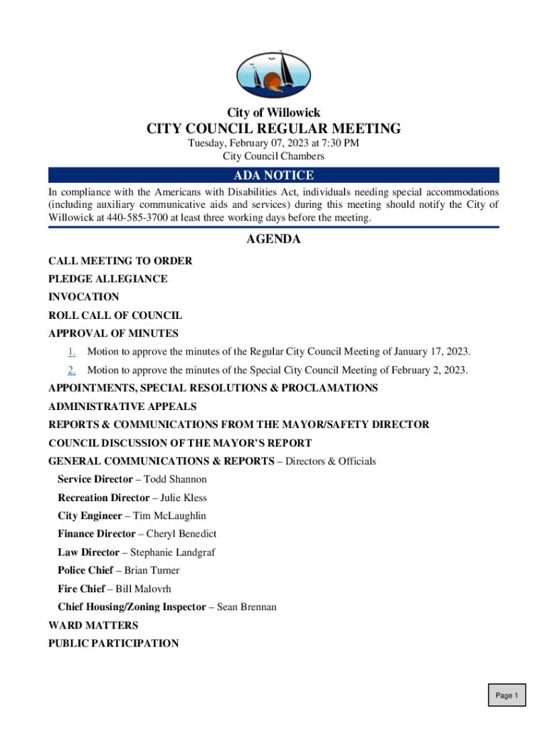 City of WillowickCITY COUNCIL REGULAR MEETING Tuesday, February 07, 2023 at 7:30 PM City Council ChambersADA NOTICE In compliance with the Americans with Disabilities Act, individuals needing special