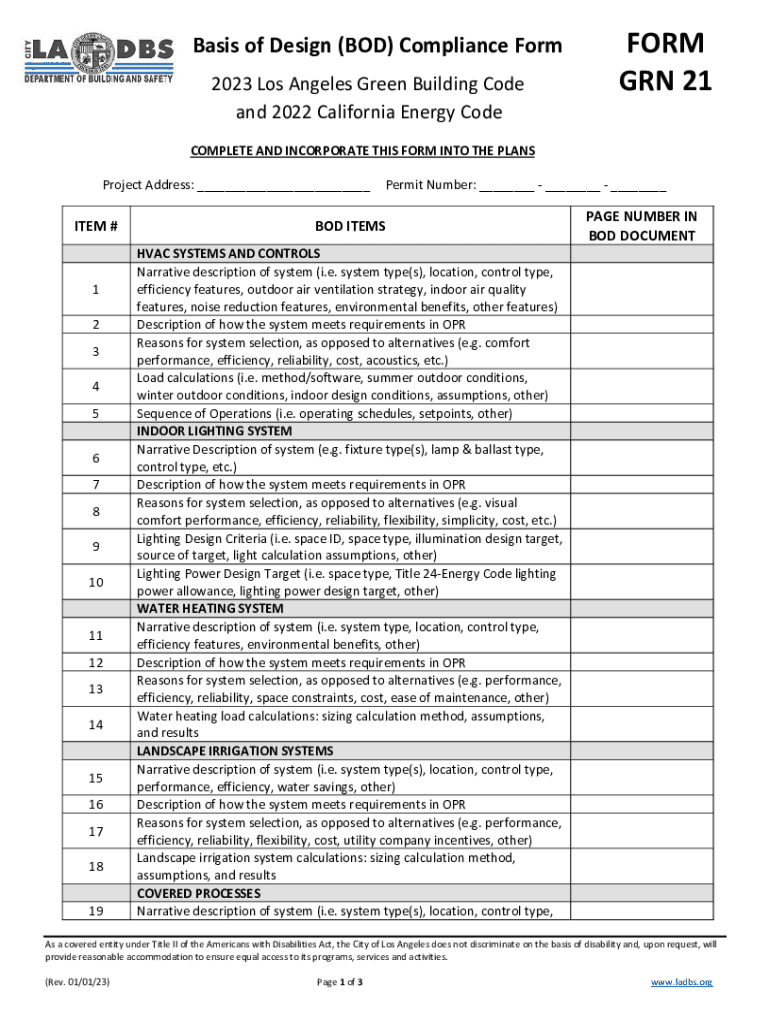 Basis of Design (BOD) Compliance Form 2023 Los Angeles Green Building Code and 2022 California Energy CodeFORM GRN 21COMPLETE AND INCORPORATE THIS FORM INTO THE PLANS Project Address: ___ITEM #1 2