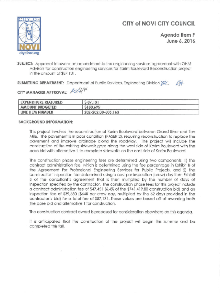 CITY of NOVI CITY COUNCIL Agenda Item F June 6, 2016SUBJECT: Approval to award an amendment to the engineering services agreement with OHM Advisors for construction engineering services for Karim