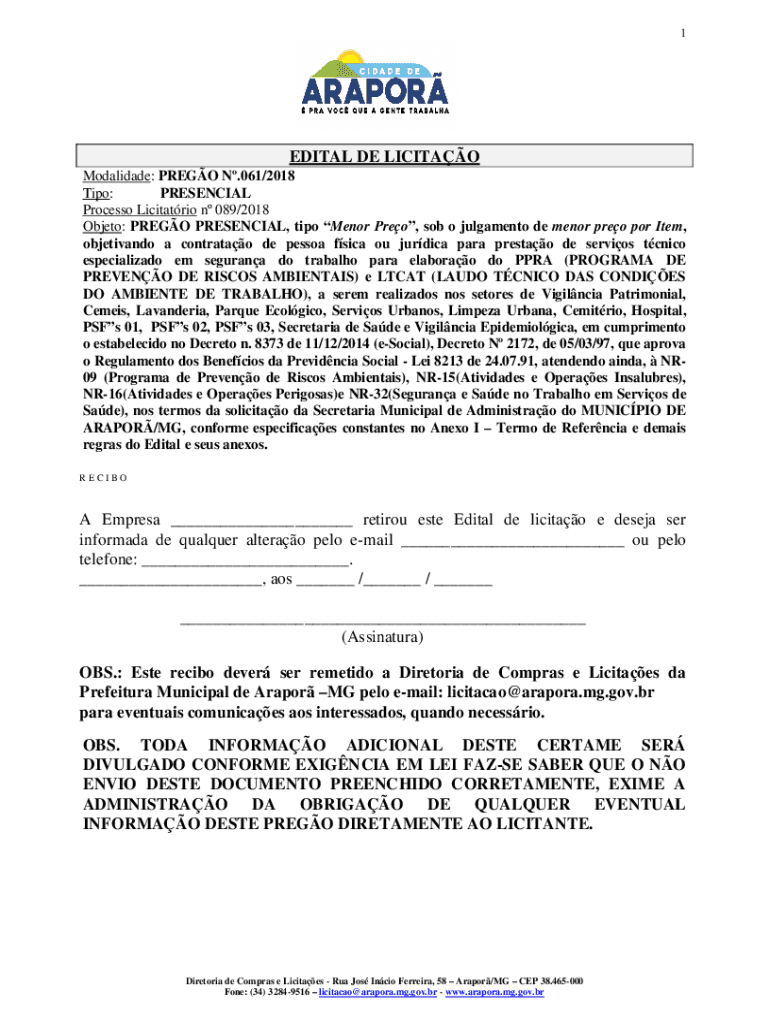 1EDITAL DE LICITAO Modalidade: PREGO N.061/2018 Tipo: PRESENCIAL Processo Licitatrio n 089/2018 Objeto: PREGO PRESENCIAL, tipo Menor Preo, sob o julgamento de menor preo por Item, objetivando a contratao