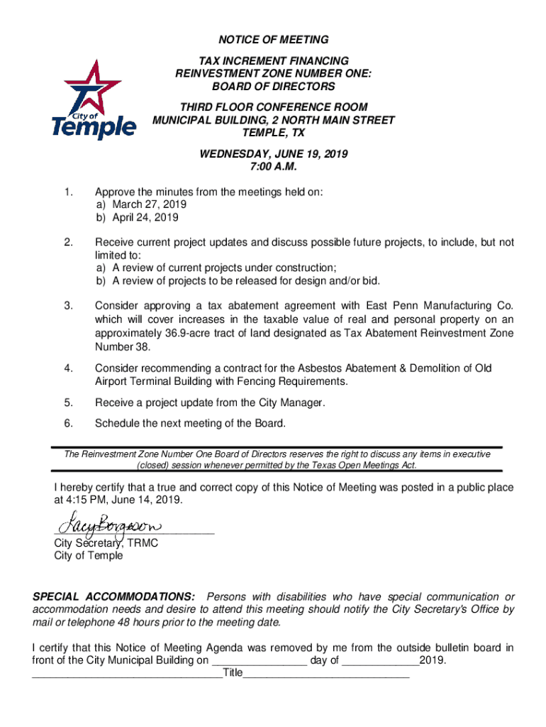 NOTICE OF MEETING TAX INCREMENT FINANCING REINVESTMENT ZONE NUMBER ONE: BOARD OF DIRECTORS THIRD FLOOR CONFERENCE ROOM MUNICIPAL BUILDING, 2 NORTH MAIN STREET TEMPLE, TX WEDNESDAY, JUNE 19, 2019 7:00