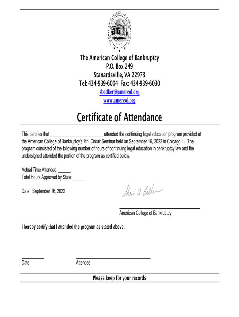 The American College of Bankruptcy P.O. Box 249 Stanardsville, VA 22973 Tel: 4349396004 Fax: 4349396030 sbedker@amercol.org www.amercol.orgCertificate of Attendance This certifies that ___ attended