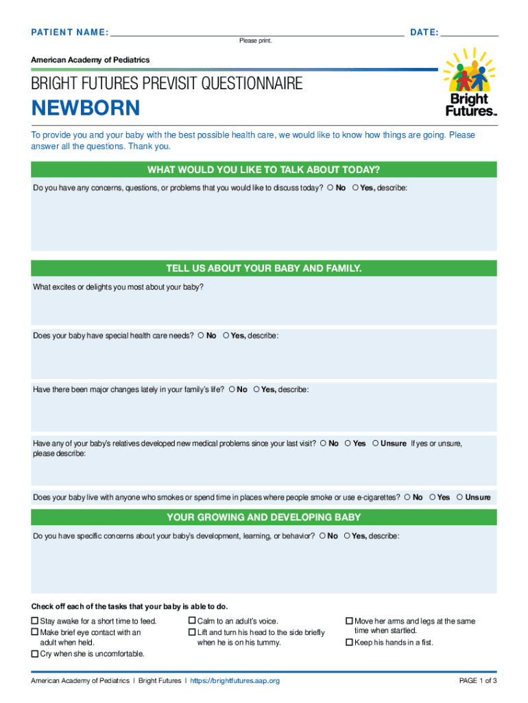 CLEAR FORMPATIENT NAME:DATE: Please print.American Academy of PediatricsBRIGHT FUTURES PREVISIT QUESTIONNAIRENEWBORNTo provide you and your baby with the best possible health care, we would like to