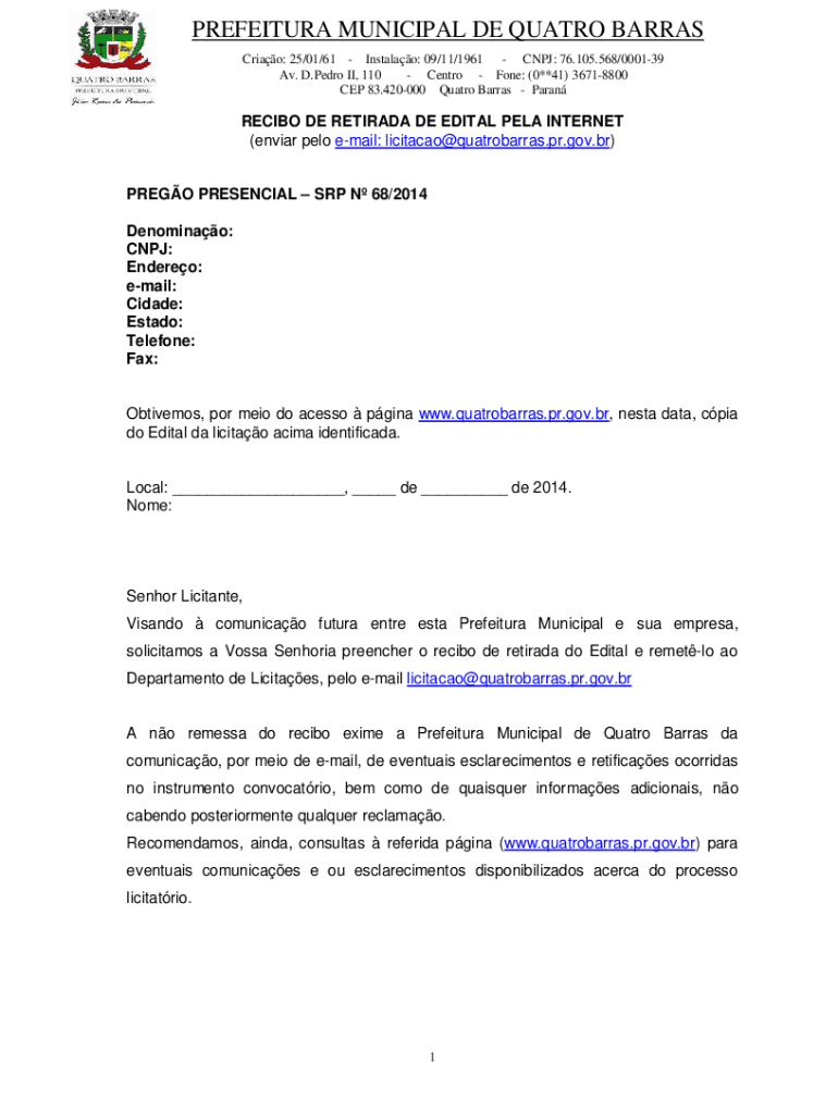 PREFEITURA MUNICIPAL DE QUATRO BARRAS Criao: 25/01/61 Instalao: 09/11/1961 CNPJ: 76.105.568/000139 Av. D.Pedro II, 110 Centro Fone: (0**41) 36718800 CEP 83.420000 Quatro Barras ParanRECIBO DE RETIRADA