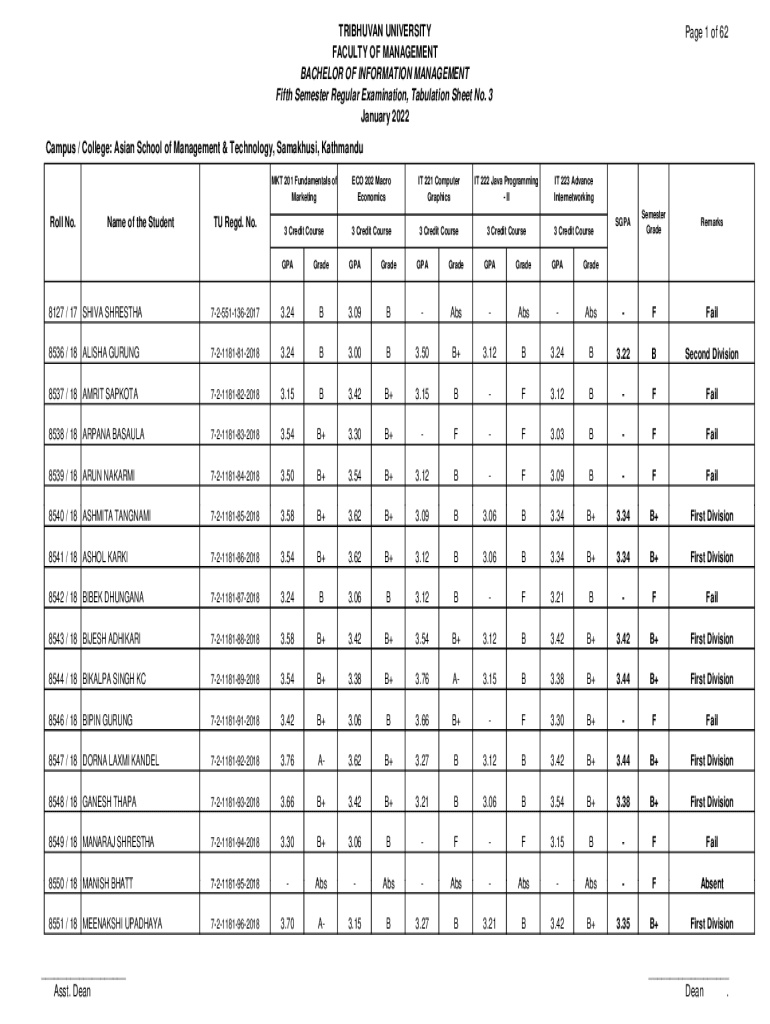 TRIBHUVAN UNIVERSITY FACULTY OF MANAGEMENT BACHELOR OF INFORMATION MANAGEMENT Fifth Semester Regular Examination, Tabulation Sheet No. 3 January 2022Page 1 of 62Campus / College: Asian School of Management