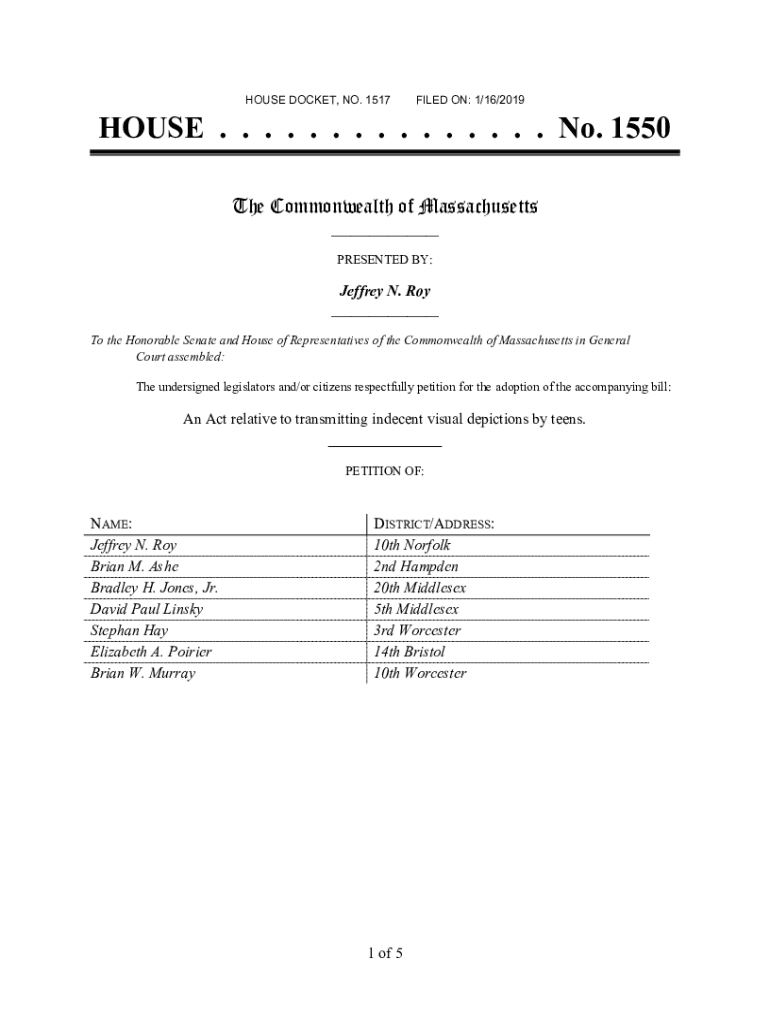 HOUSE DOCKET, NO. 1517FILED ON: 1/16/2019HOUSE . . . . . . . . . . . . . . . No. 1550 The Commonwealth of Massachusetts ___ PRESENTED BY:Jeffrey N. Roy ___ To the Honorable Senate and House of Representatives