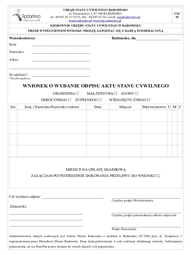 URZD STANU CYWILNEGO RADOMSKO ul. Narutowicza 1, 97500 RADOMSKO tel. 44/685 45 51/52/53, fax: 44/685 45 50, email: usc@radomsko.pl www.radomsko.pl www.bip.radomsko.plUSC 01KIEROWNIK URZDU STANU CYWILNEGO