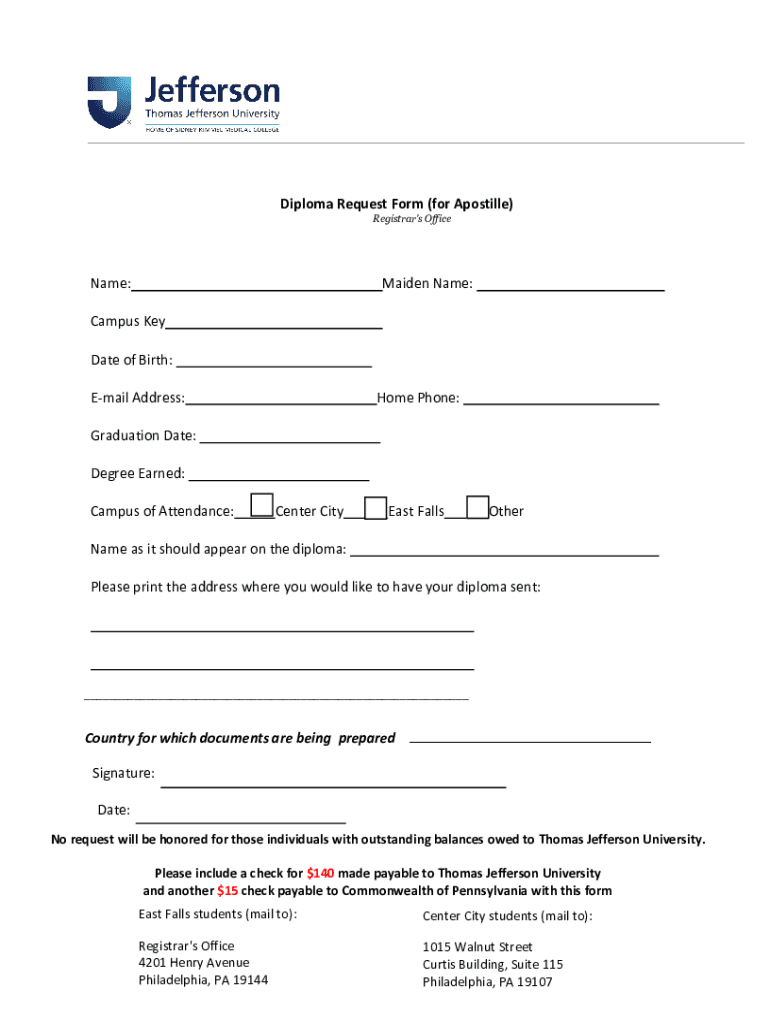 Diploma Request Form (for Apostille) Registrar\'s OfficeName:Maiden Name:Campus Key Date of Birth: Email Address:Home Phone:Graduation Date: Degree Earned: Campus of Attendance:Center CityEast FallsOtherName