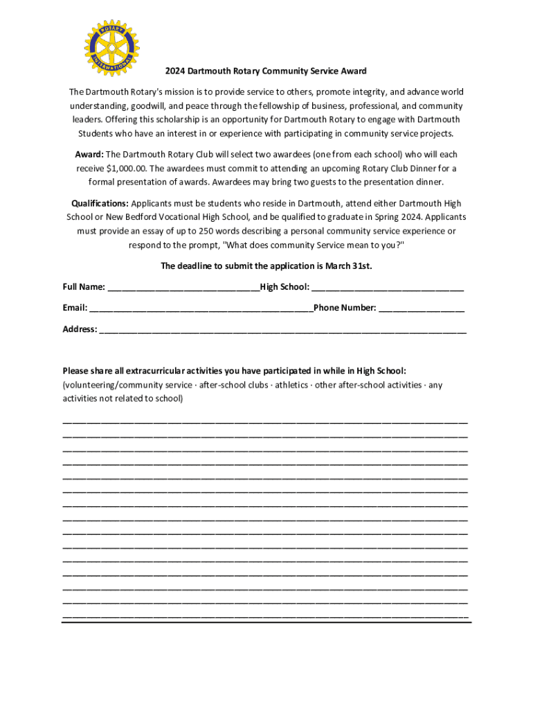 2024 Dartmouth Rotary Community Service Award The Dartmouth Rotary\'s mission is to provide service to others, promote integrity, and advance world understanding, goodwill, and peace through the fellowship