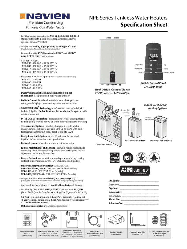 NPE Series Tankless Water Heaters Specification SheetPremium Condensing Tankless Gas Water Heater (6)) ANSI Z21.10.3/CSA 4.32013 ! +\'! DEC0 ( / \'!1/2 gas pipe up to a length of 24 ft* +, 4 / 0(