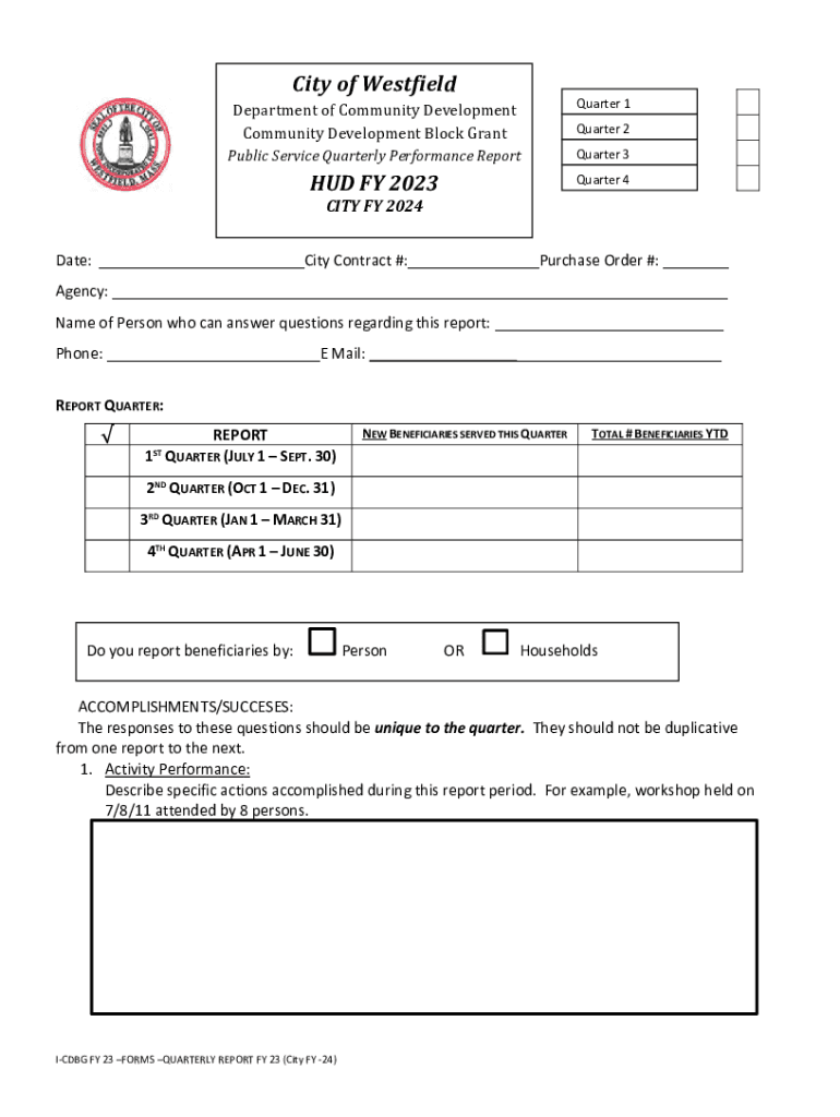City of WestfieldQuarter 1Department of Community Development Community Development Block Grant Public Service Quarterly Performance ReportQuarter 2HUD FY 2023Quarter 4Quarter 3CITY FY 2024 Date: