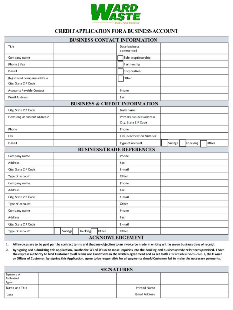 CREDIT APPLICATION FOR A BUSINESS ACCOUNT BUSINESS CONTACT INFORMATION TitleDate business commencedCompany name Sole proprietorshipPhone | Fax PartnershipEmail CorporationRegistered company address