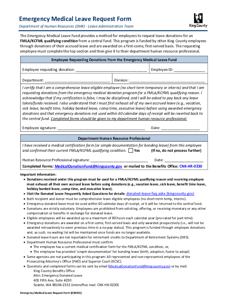 Emergency Medical Leave Request Form Department of Human Resources (DHR) Leave Administration Team The Emergency Medical Leave Fund provides a method for employees to request leave donations for an