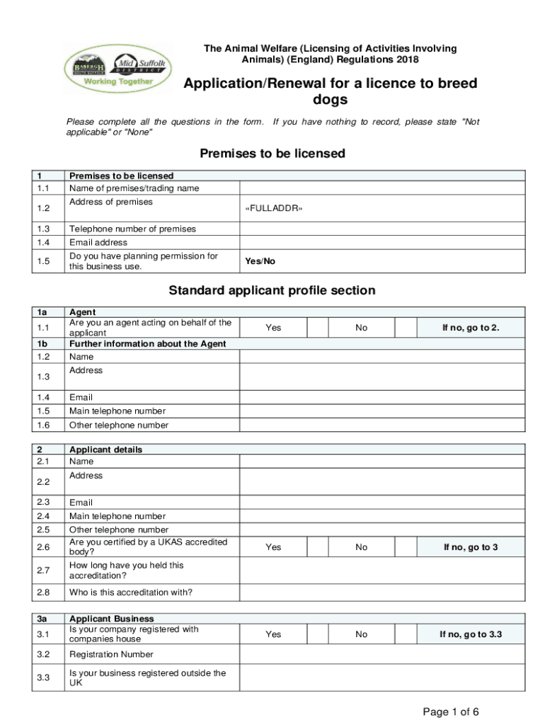 The Animal Welfare (Licensing of Activities Involving Animals) (England) Regulations 2018Application/Renewal for a licence to breed dogs Please complete all the questions in the form. If you have