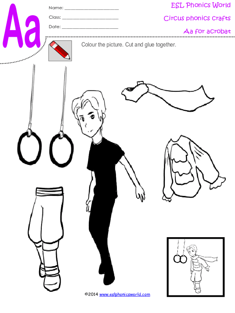 Name: ___ Class: ___ESL Phonics World Circus phonics craftsDate: ___Colour the picture. Cut and glue together.2014 www.eslphonicsworld.comAa for acrobat