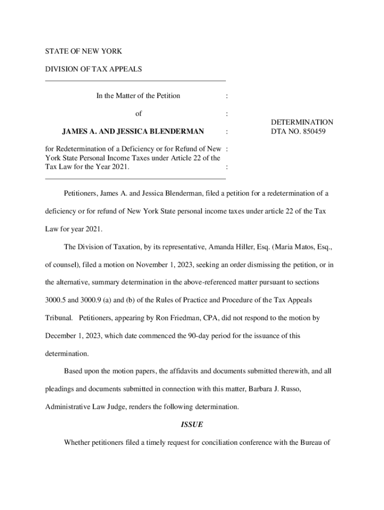 STATE OF NEW YORK DIVISION OF TAX APPEALS ___ In the Matter of the Petition:of:JAMES A. AND JESSICA BLENDERMAN:DETERMINATION DTA NO. 850459for Redetermination of a Deficiency or for Refund of New