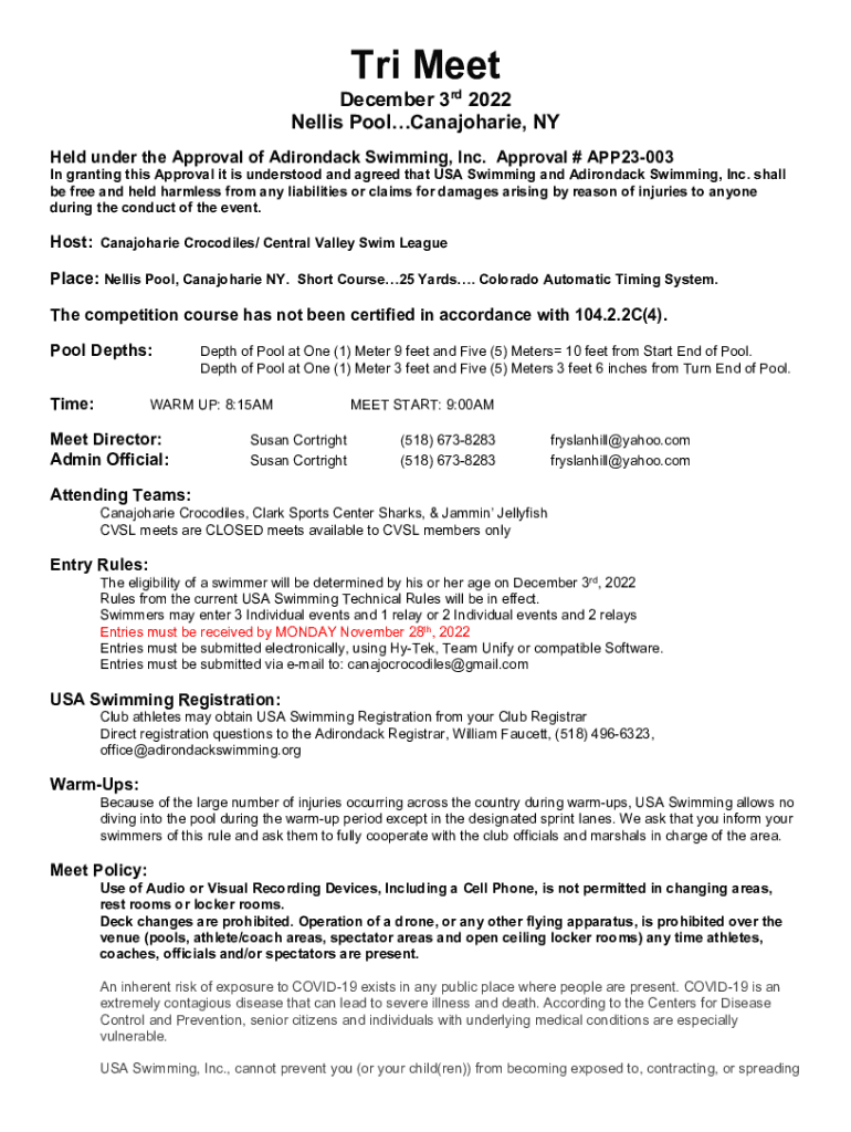 Tri MeetDecember 3rd 2022 Nellis PoolCanajoharie, NY Held under the Approval of Adirondack Swimming, Inc. Approval # APP23003In granting this Approval it is understood and agreed that USA Swimming