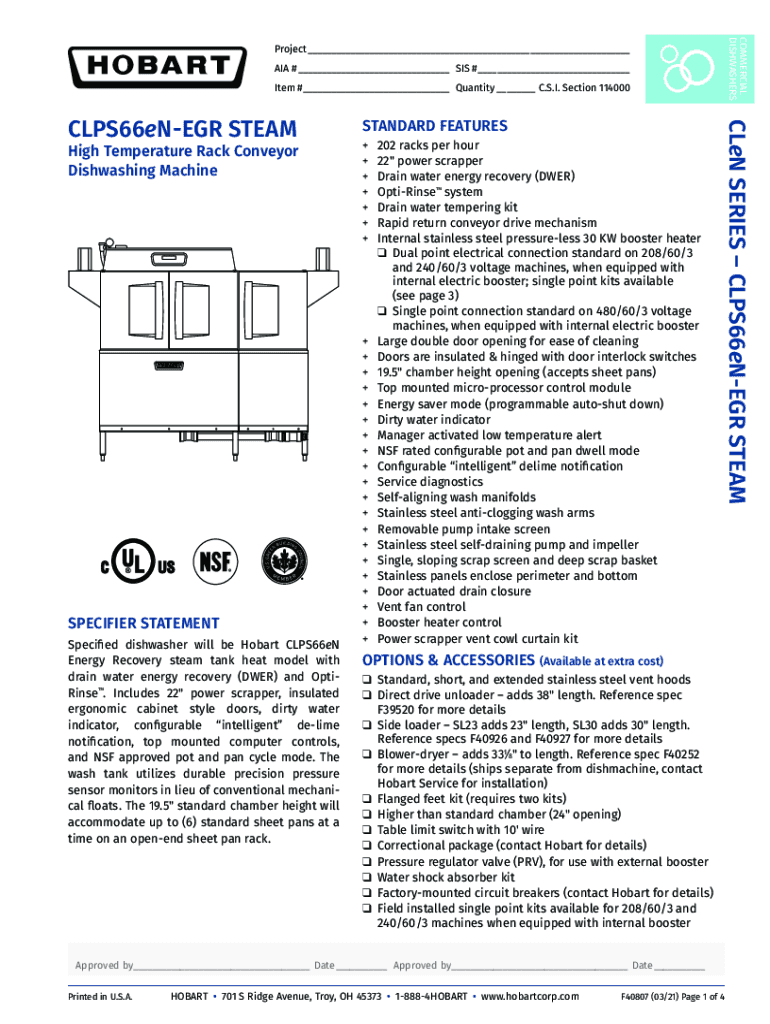 COMMERCIAL DISHWASHERSProject___ AIA #___SIS #___ Item #___Quantity___C.S.I. Section 114000High Temperature Rack Conveyor Dishwashing MachineSPECIFIER STATEMENT Specified dishwasher will be Hobart
