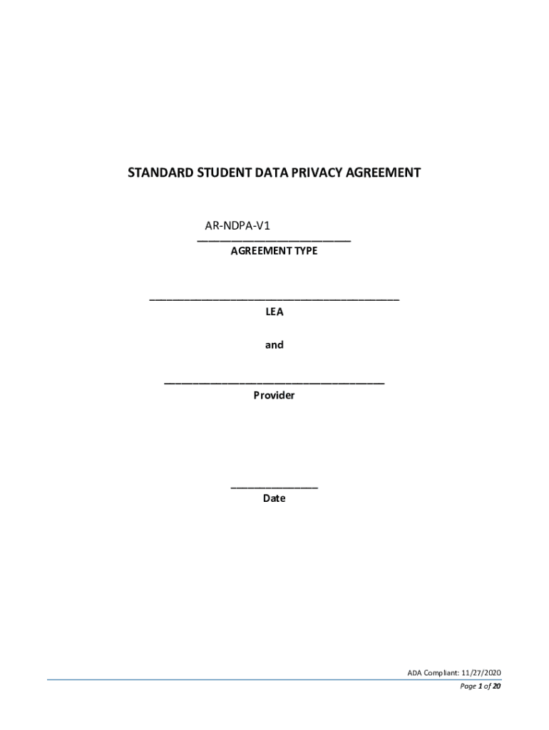STANDARD STUDENT DATA PRIVACY AGREEMENT ARNDPAV1___ AGREEMENT TYPE ___ LEA and ___ Provider___ DateADA Compliant: 11/27/2020 Page 1 of 20This Student Data Privacy Agreement (DPA) is entered into on