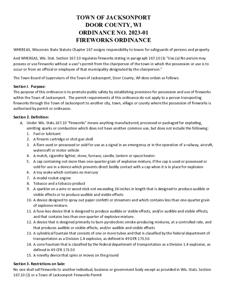 TOWN OF JACKSONPORT DOOR COUNTY, WI ORDINANCE NO. 202301 FIREWORKS ORDINANCE WHEREAS, Wisconsin State Statute Chapter 167 assigns responsibility to towns for safeguards of persons and property And