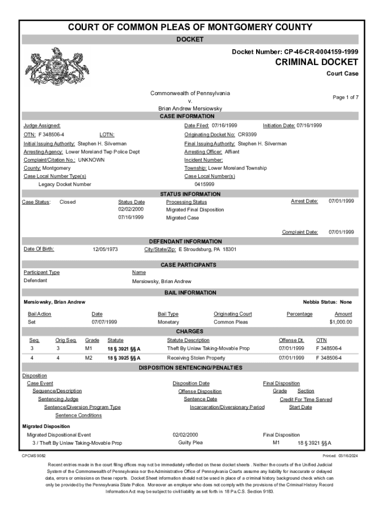 COURT OF COMMON PLEAS OF MONTGOMERY COUNTY DOCKET Docket Number: CP46CR00041591999CRIMINAL DOCKET Court Case Commonwealth of Pennsylvania v. Brian Andrew Mersiowsky CASE INFORMATION Date Filed: 07/16/1999Judge
