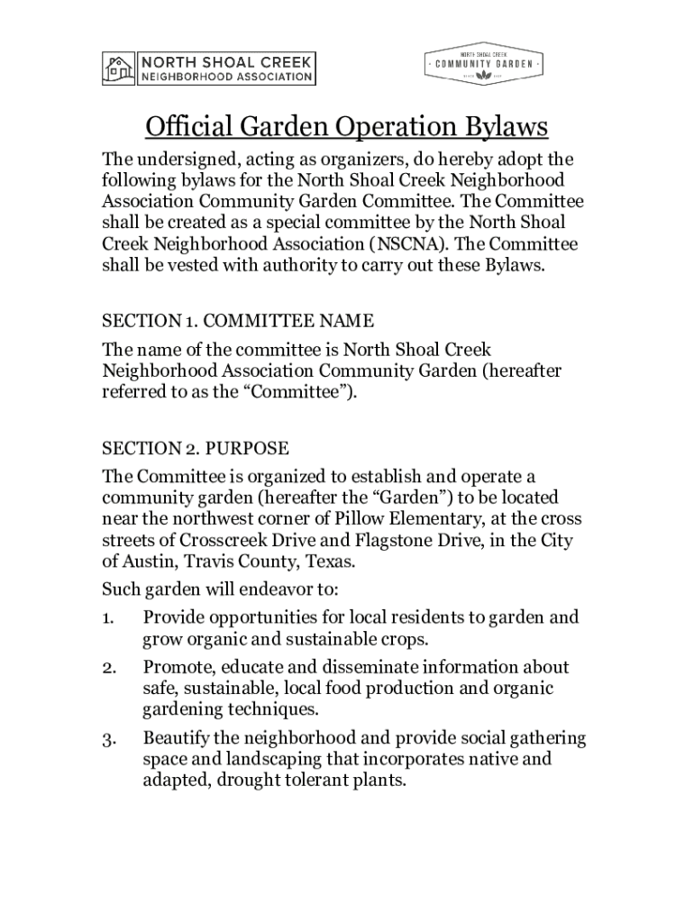 Official Garden Operation Bylaws The undersigned, acting as organizers, do hereby adopt the following bylaws for the North Shoal Creek Neighborhood Association Community Garden Committee. The Committee