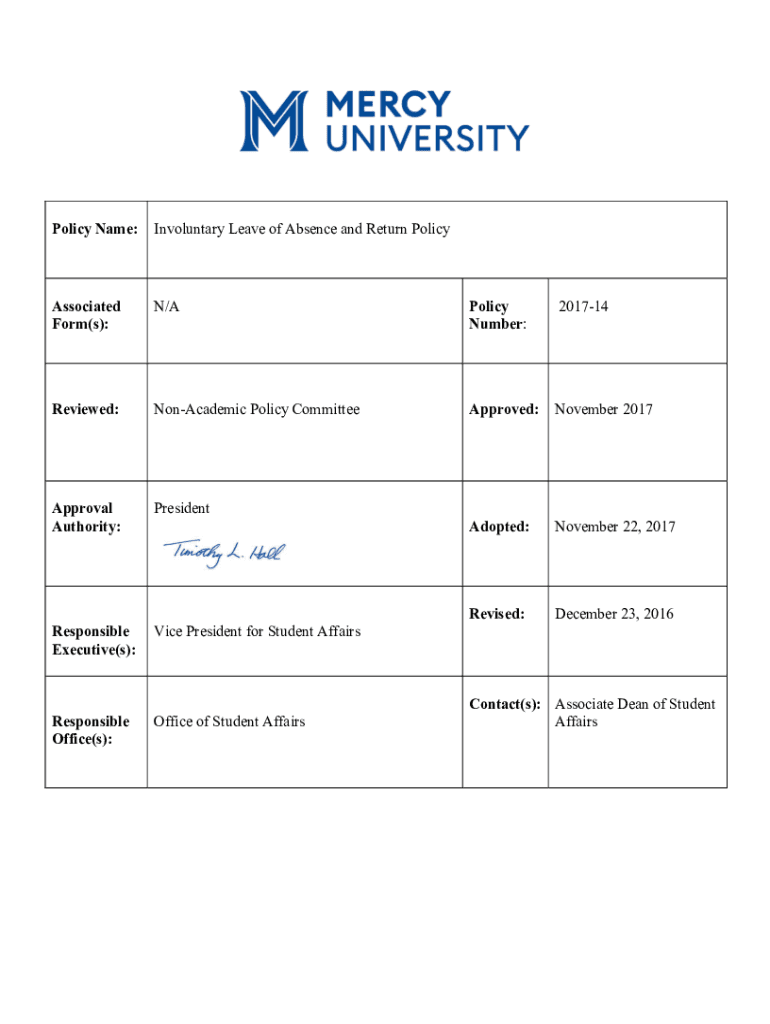 Policy Name:Involuntary Leave of Absence and Return PolicyAssociated Form(s):N/APolicy Number:201714Reviewed:NonAcademic Policy CommitteeApproved:November 2017Approval Authority:President Adopted:November
