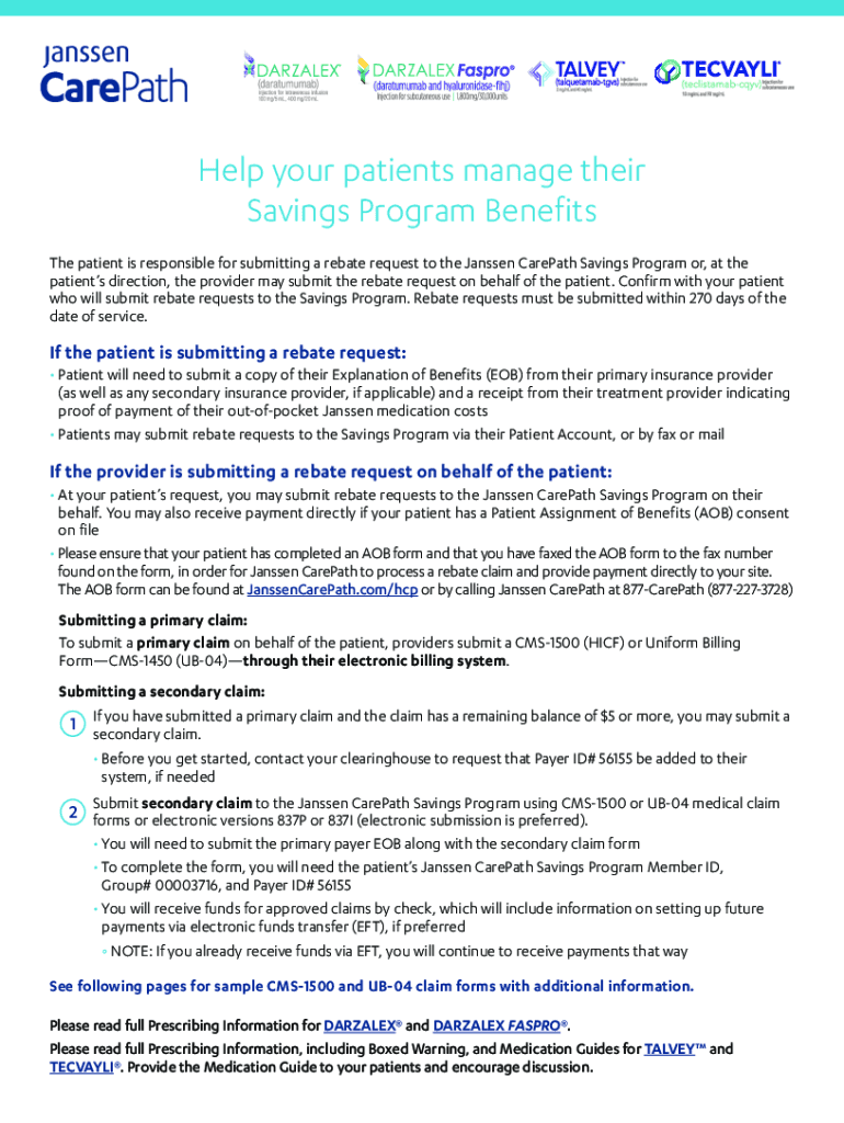 Help your patients manage their Savings Program Benefits The patient is responsible for submitting a rebate request to the Janssen CarePath Savings Program or, at the patients direction, the provider