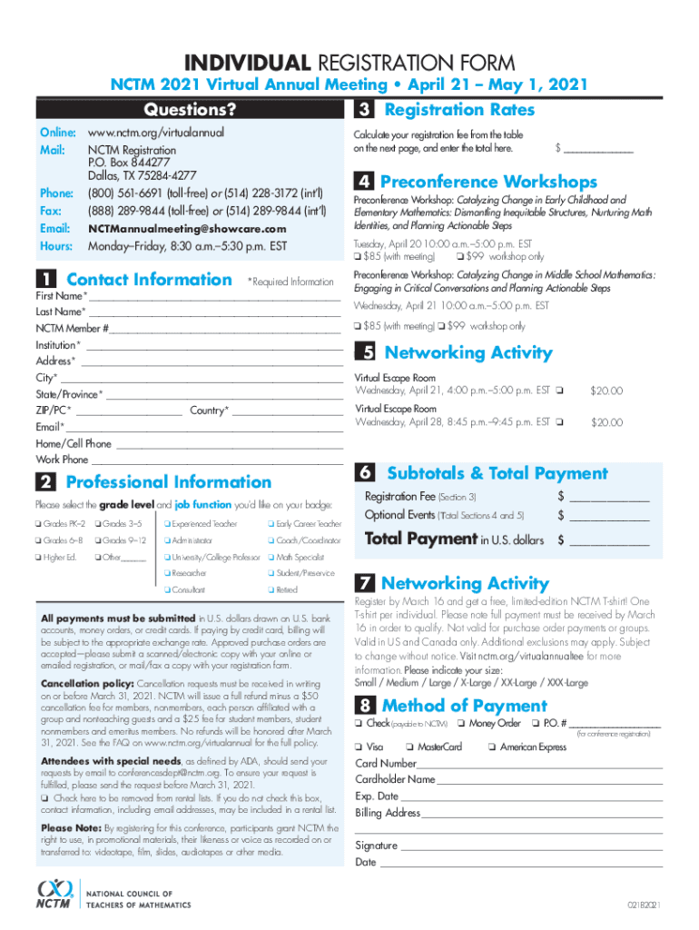 INDIVIDUAL REGISTRATION FORMNCTM 2021 Virtual Annual Meeting April 21 May 1, 20213 Registration RatesQuestions? Online:www.nctm.org/virtualannual Mail: NCTM Registration P.O. Box 844277 Dallas, TX