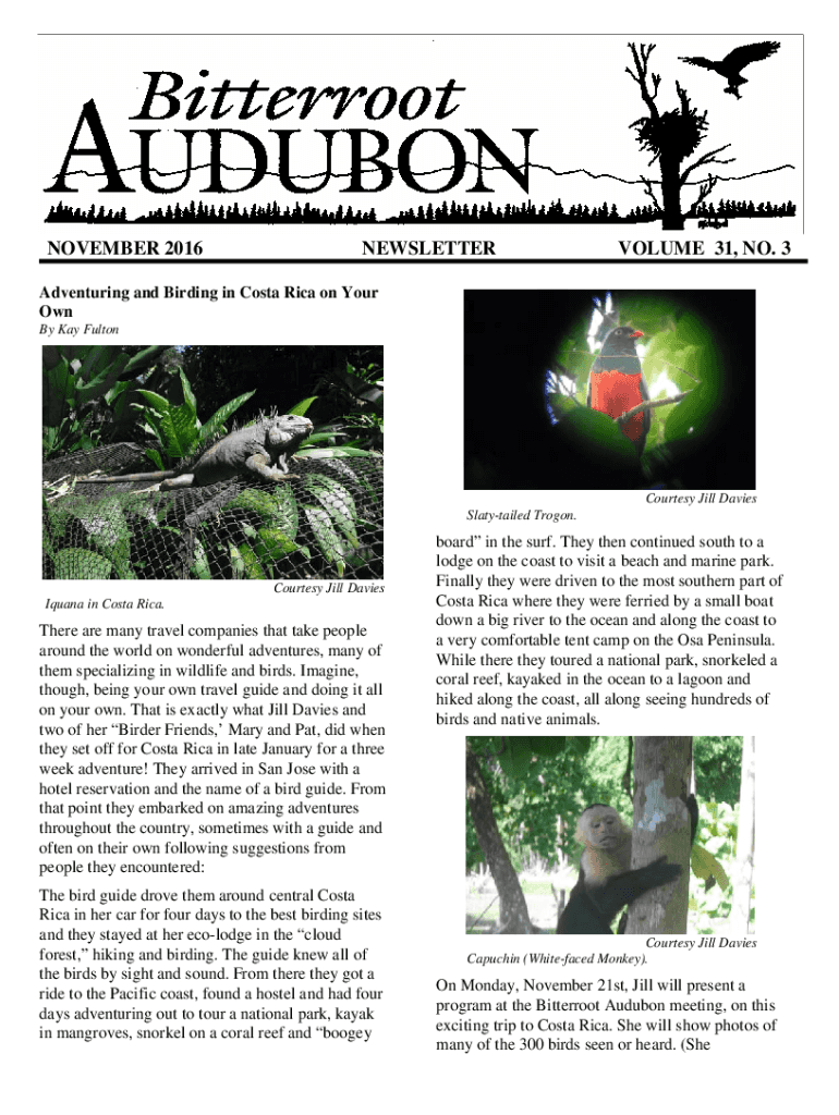 NOVEMBER 2016NEWSLETTERVOLUME 31, NO. 3Adventuring and Birding in Costa Rica on Your Own By Kay FultonCourtesy Jill Davies Slatytailed Trogon.Courtesy Jill Davies Iquana in Costa Rica.There are many